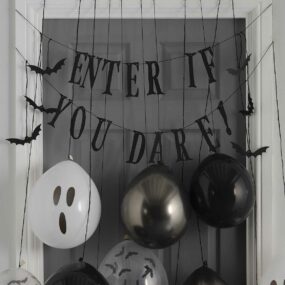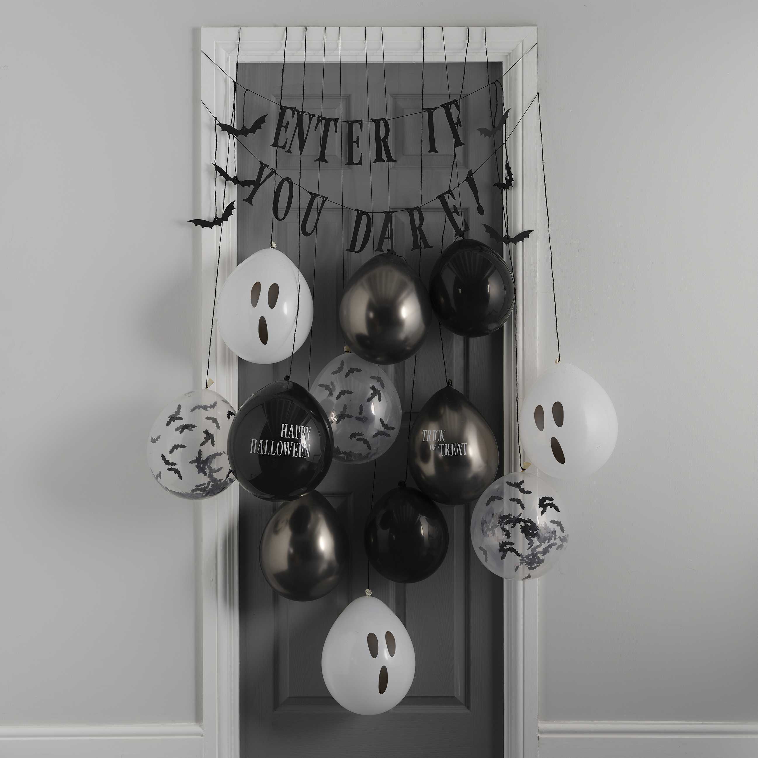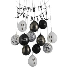 Verwandle dein Zuhause in ein Spukhaus mit diesem schaurigen Halloween-Türdekorationsset. Sorge bei deinen Gästen für Gänsehaut mit diesem Ballon-Set – die perfekte Dekoration für deine Halloween-Party in dieser gruseligen Jahreszeit. Verwende diese Halloween-Ballons als lustige Party-Halloween-Kulisse, die deine Gäste genießen können. Jedes Ballontür-Set enthält: 1 x Schwarze ‘Enter if you Dare’ Wimpel an 2 Strängen 2 x 30,48 cm Schwarze Luftballons 2 x 30,48 cm Graue Luftballons 3 x 30,48 cm Schwarze Fledermaus-Konfetti-Luftballons 3 x 30,48 cm Luftballons mit Geistergesicht 1 x 30,48 cm schwarzer Luftballon ‘Happy Halloween 1 x 30,48 cm ‘Trick or Treat’ Ballon in Chrom 6 Fledermäuse 14 m schwarzes Garn Warn- und Sicherheitshinweis: Luftballone sind nicht für Kinder unter 3 Jahren geeignet. Kinder unter 8 Jahren können an nicht aufgeblasenen oder geplatzten Ballons ersticken. Die Aufsicht durch Erwachsene ist erforderlich. Nicht aufgeblasene Ballons sind von Kindern fernzuhalten und geplatzte Ballons sind unverzüglich zu entfernen. Es droht akute Erstickungsgefahr beim Verschlucken von Ballonfetzen. Zum Aufblasen der Ballone bitte eine Pumpe verwenden. Hergestellt aus Naturkautschuklatex, der Allergien verursachen kann. Die Verpackung bitte aufbewahren.